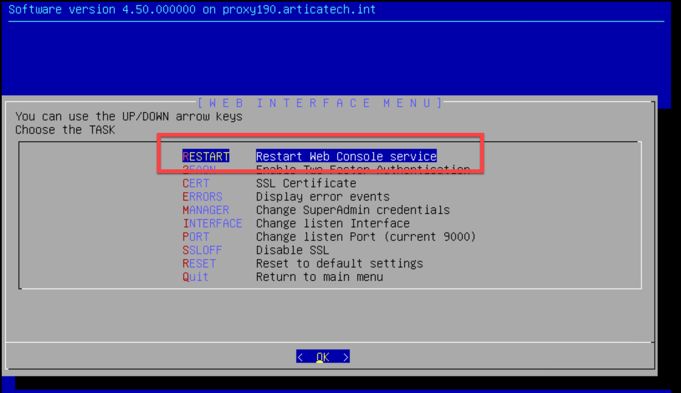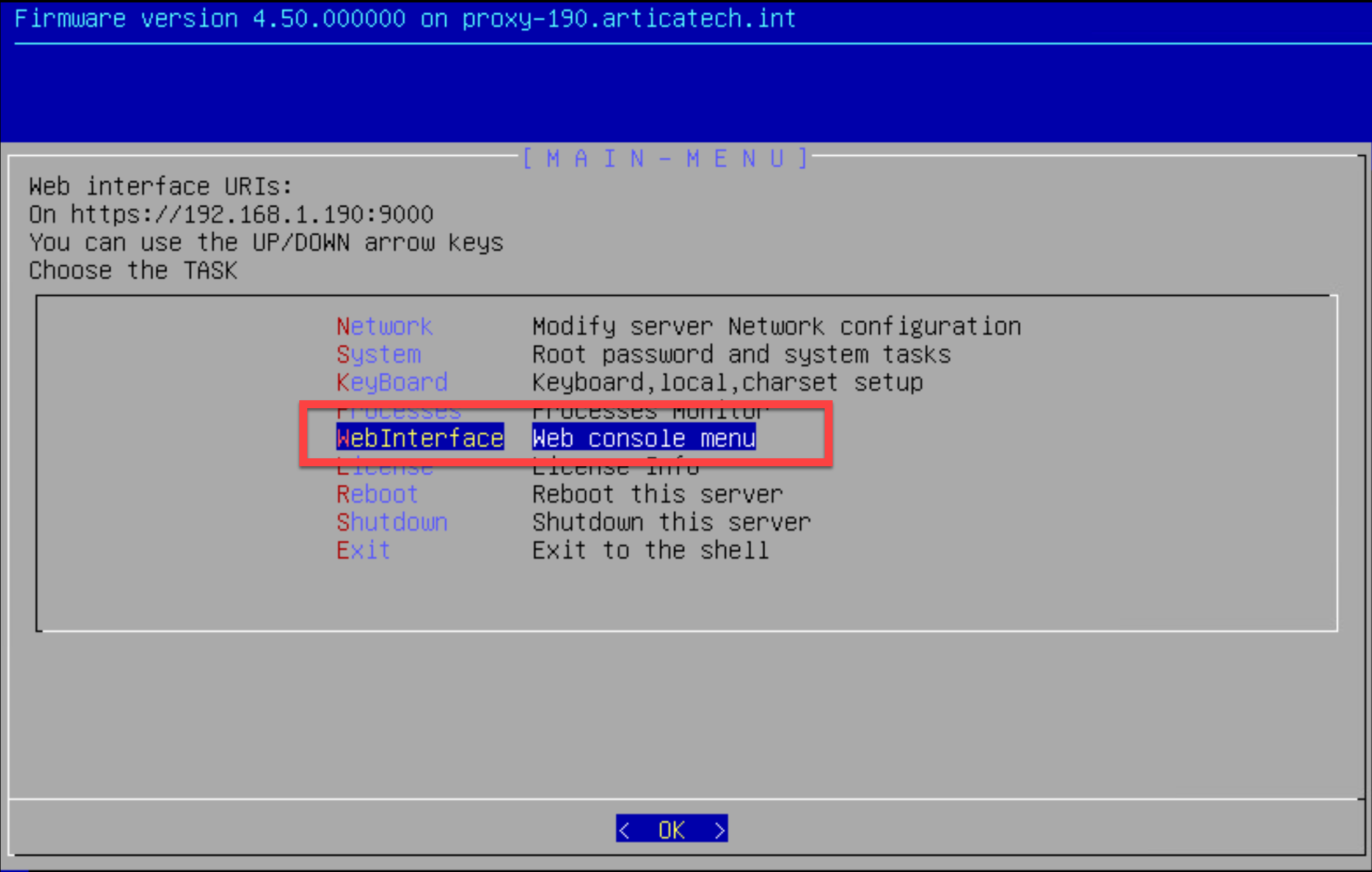 If you don't have physical access to the Unix console but have enabled SSH access, open an SSH session and run /usr/share/artica-postfix/logon.sh