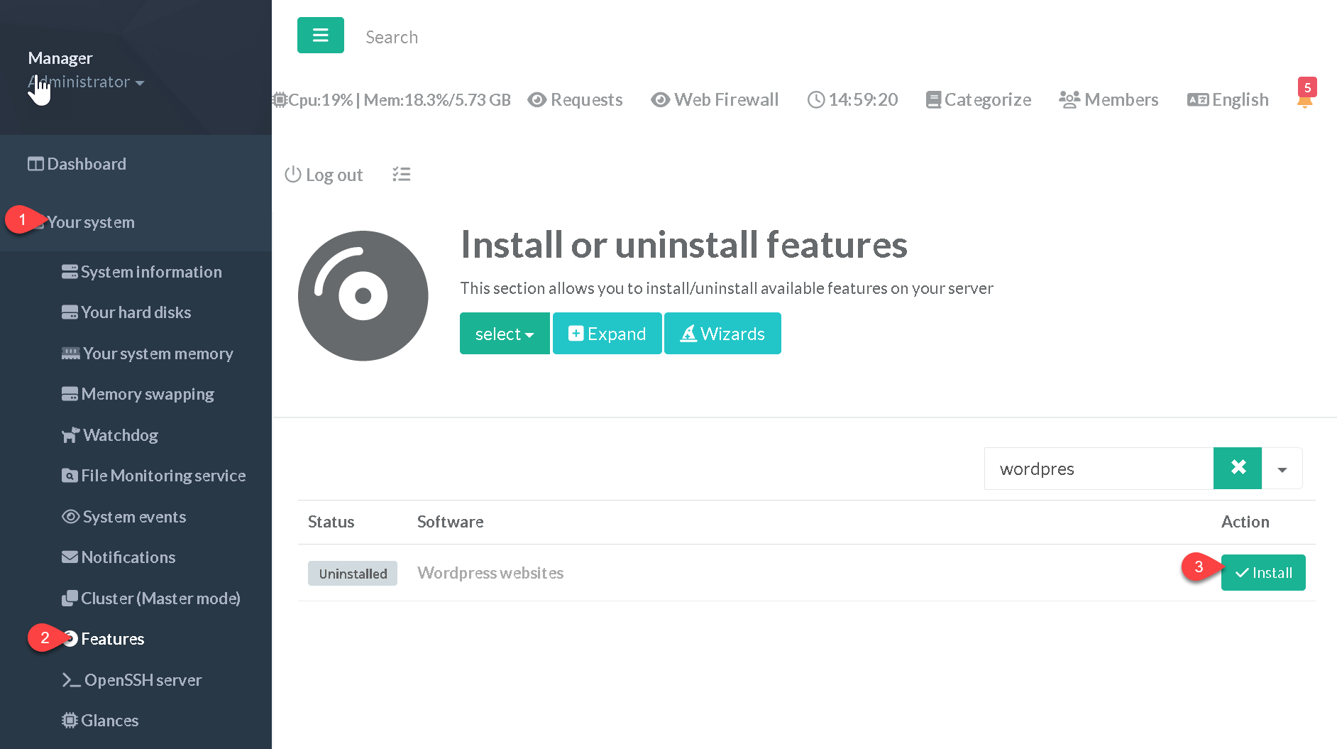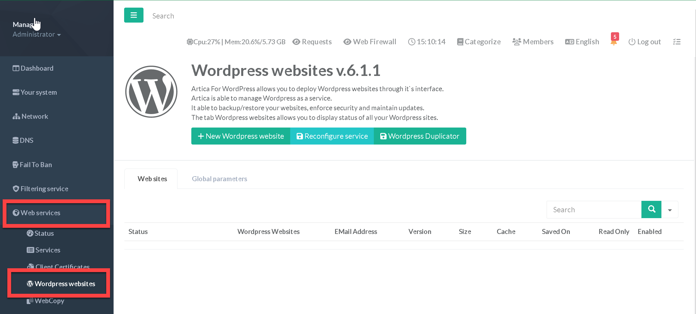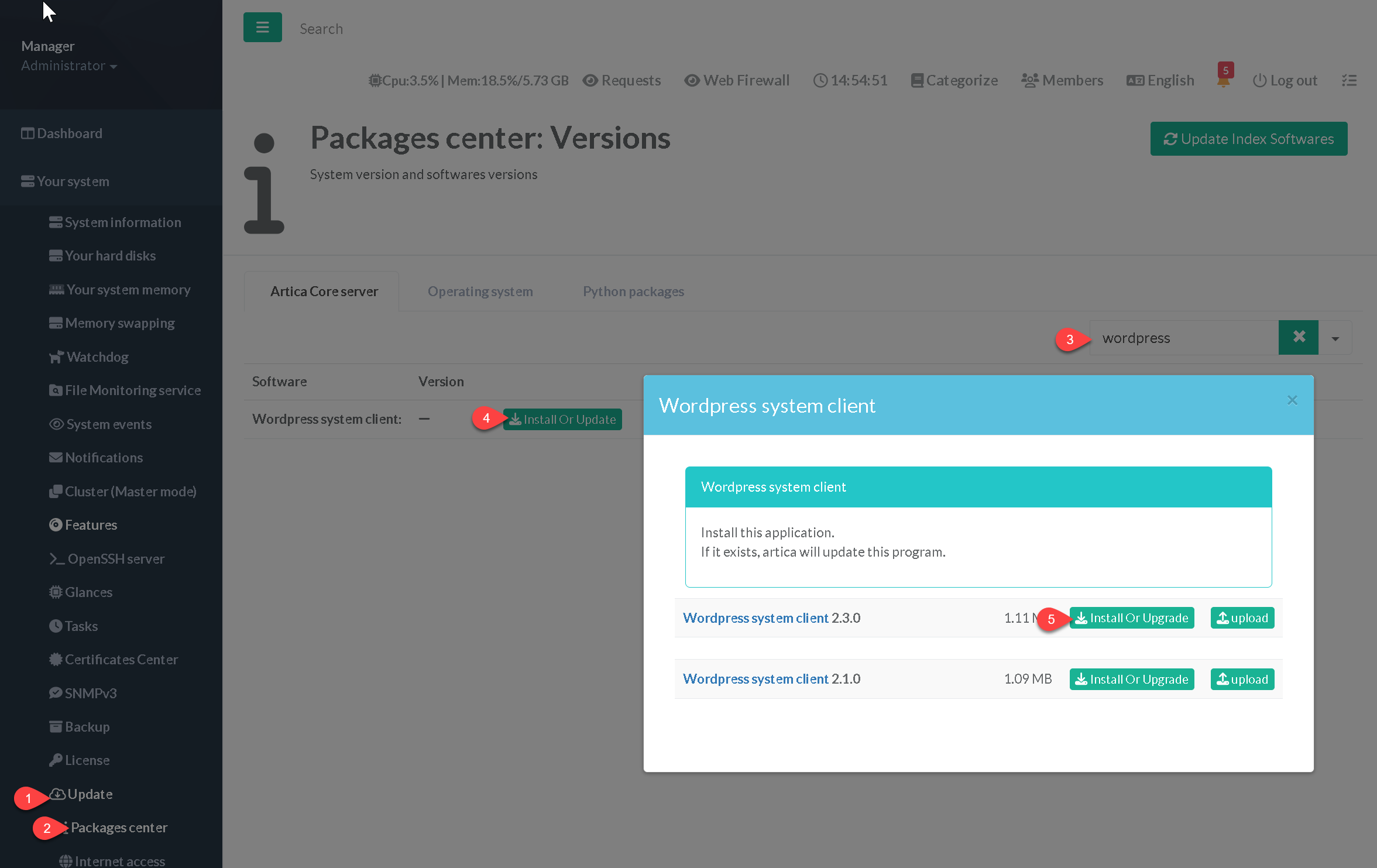 Before attempting to install Artica for Wordpress, you must enable the Reverse-Proxy feature and install the Wordpress system client.